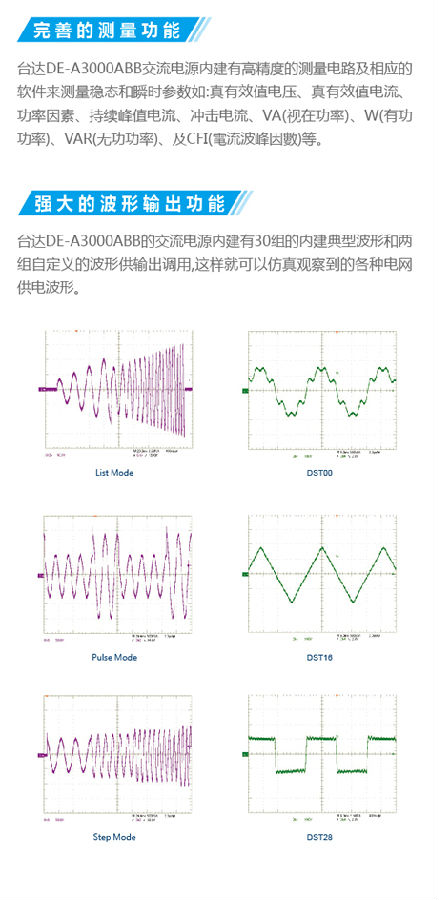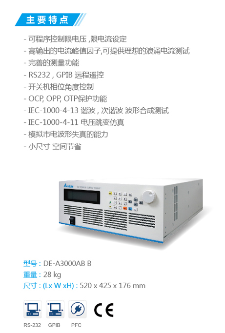 臺達DEA3000AB交流電源供應器是一款高性能的交流電源供應器,采用先進的數(shù)字信號處理技術,可以提供精準的電力參數(shù)量測,如電壓均方根值(vrms),電流均方根值(rms),有功功率( Active Power),視在功率(VA),功率因素(PF)等.以及內建30組豐富實用波形的合成功能。輸出大功率達3000W,30-1KHz輸出頻率可調節(jié),并可通過GPIB或RS232進行遠程控制。從研發(fā)的設計驗證質量檢驗到生產(chǎn)測試提供使用者一個大的選擇。本產(chǎn)品適合應用于般商業(yè)產(chǎn)品電力電子業(yè)界航空電子領域軍事跟法規(guī)測試等應用且無論是實驗室測試還是大規(guī)模生產(chǎn)測試均適用。